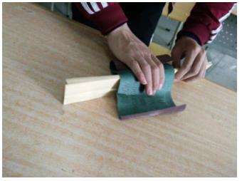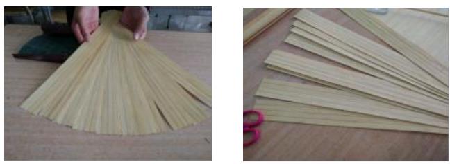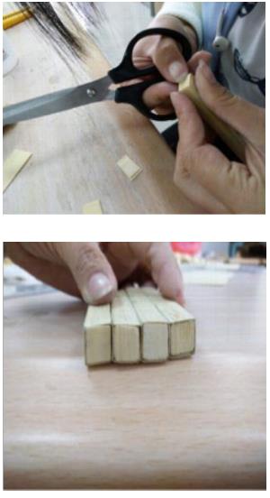 | ③ 由于竹皮质地粗糙,将裁剪完的竹条用砂纸打磨,打去竹皮的毛边,这样便于 502 胶的粘合。