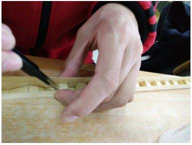 | ④ 轻轻划过外皮四个面之间的缝隙,沿划过的痕迹轻轻折起外皮,方便杆件粘合。但不要完全裁断,以保留部分强度,防止杆件受力时外皮之间崩开。