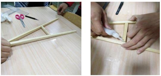 ① 先将基本构件所需拼接的位置用铅笔标记,后拼接。拼接时下部设透明胶或报纸,防止构件与桌子相连。且拼接杆件时注意根据内部肋的方向及杆件的受力形式确定杆件的放置方式。 |