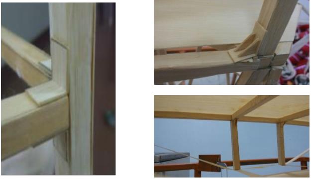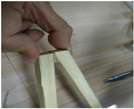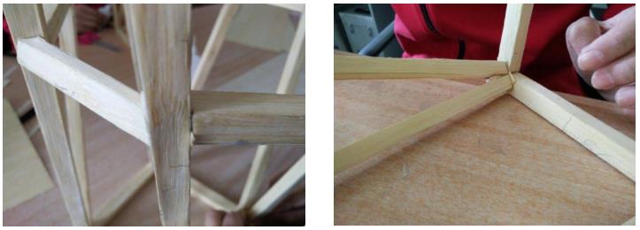 杆件的尺寸同设计要求难免存在误差,所以杆件的连接处也难免存在缝隙,这时将缝隙用竹皮填满,滴上 502 胶水即可。由于 502 胶水的强度甚至高于竹皮强度,这样的做法并不削弱结点的连接。